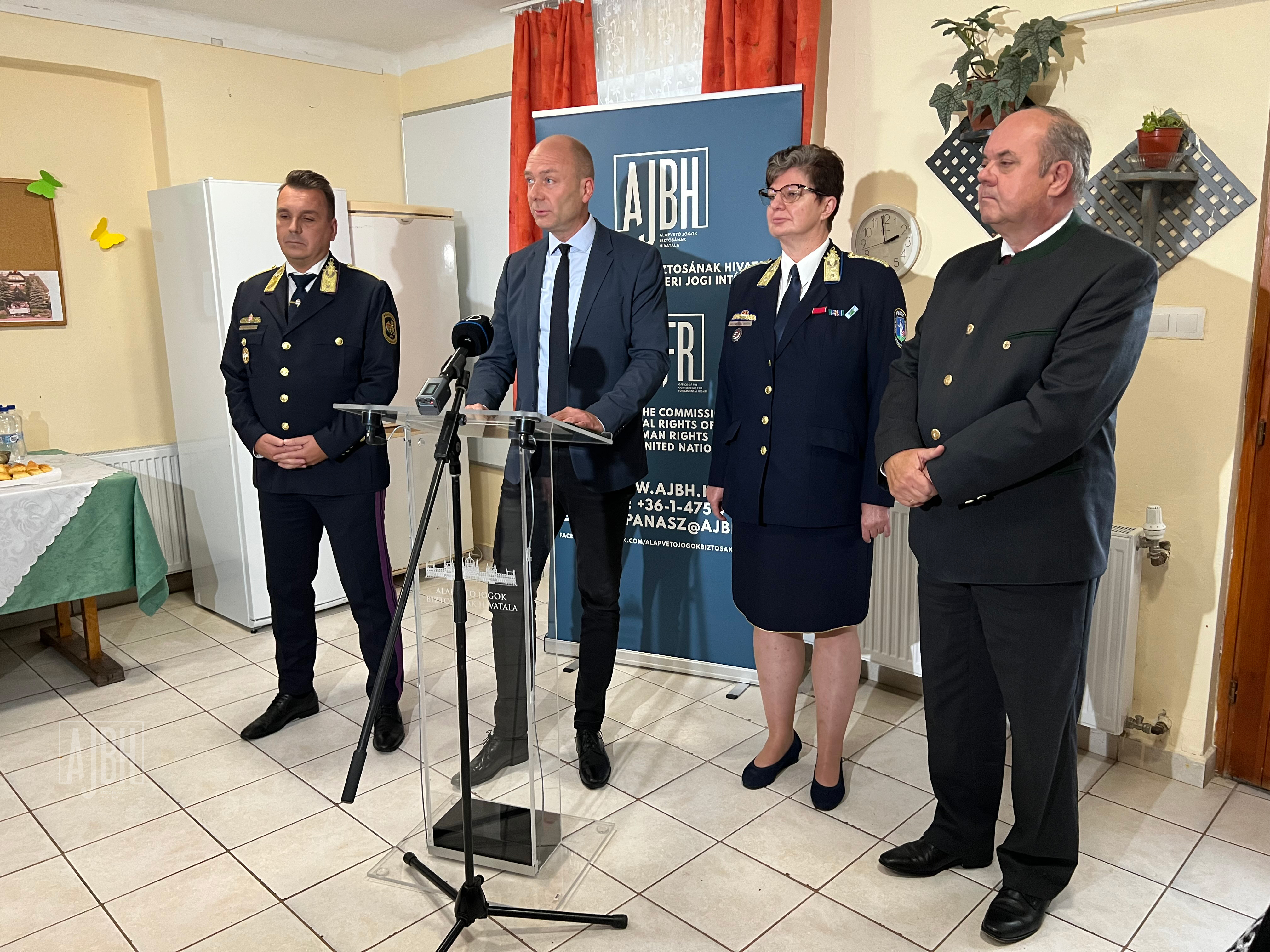 On 04 October 2023, the Commissioner for Fundamental Rights of Hungary paid a visit to the Ipolypart Fészek Children’s Home, to which event he was accompanied by Prison Brigadier General, Deputy Director General for Finance and IT of the National Commander of the Hungarian Prison Service Mr. Tamás Farsang, State Secretary for Forests and Land Affairs Mr. Péter Zambó, Police Brigadier General, Police Superintendent of Nógrád County Dr. Gabriella Somssich, as well as CEO of Ipoly Erdő Zrt Mr. László Kiss, where Dr. Ákos Kozma announced a new stage of the children’s home renovation programme.
